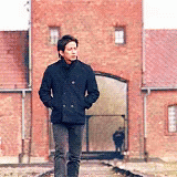 Junichi Okada walking on train tracks in front of the iconic brick gatehouse of Auschwitz-Birkenau.