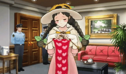 Juniper Woods from Ace Attorney is seen diligently knitting a red scarf with white hearts.
