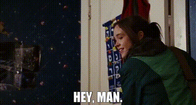 Elliot Page as Juno, wearing a green jacket, greets someone with a cheerful 'Hey, man.'