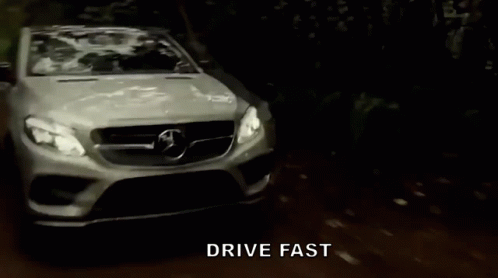 A Mercedes-Benz SUV drives rapidly down a dark, unpaved road, with the text 'DRIVE FAST' displayed.