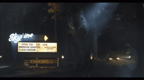 Rexy, the Tyrannosaurus Rex from Jurassic World, leaves a drive-in theater at night, with the Skyline sign visible.