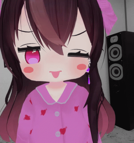 Jururu in pink pajamas playfully winks and sticks out her tongue, a cute and mischievous expression.