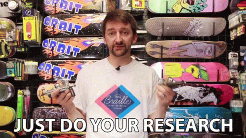 Aaron Kyro from Braille Skateboarding advises viewers to 'Just Do Your Research' while holding skateboard trucks.