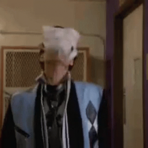 A character from the 80s movie 'Just One Of The Guys' removes a paper from his face in a hallway.