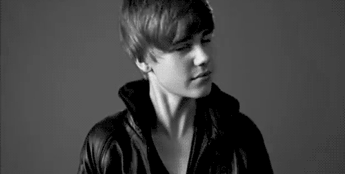 Justin Bieber doing his signature hair flip in a black and white shot, wearing a leather jacket.