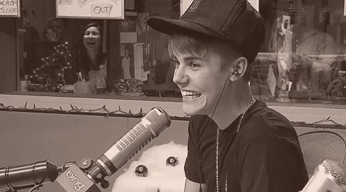 Justin Bieber smiling and laughing while sitting in a radio studio, captured in a sepia-toned moment.