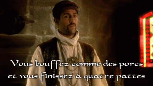 Venec from Kaamelott delivers a memorable line about eating like pigs and ending up on all fours.