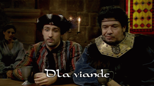 Venec from Kaamelott discusses meat cooked in its own fat at a table with another character.
