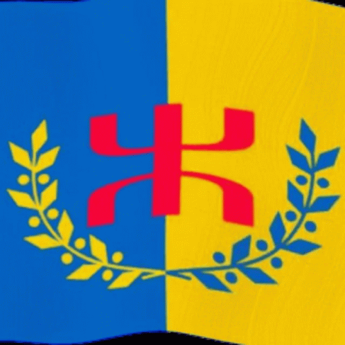 The vibrant Kabyle flag, featuring a blue and yellow background with a red Berber 'Yaz' symbol and laurel wreath.