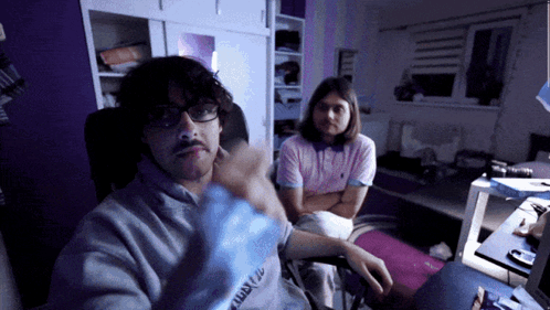 a man wearing a sweatshirt that says just do it sits in front of a woman