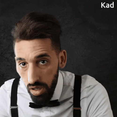 Kad, a man in suspenders and bow tie, reacts with a shocked and surprised expression, covering his mouth.