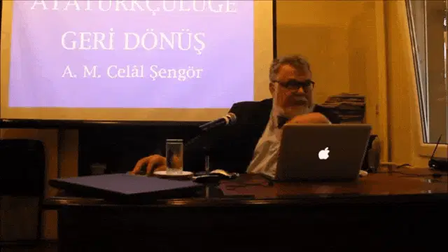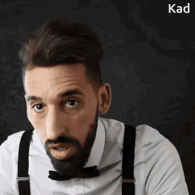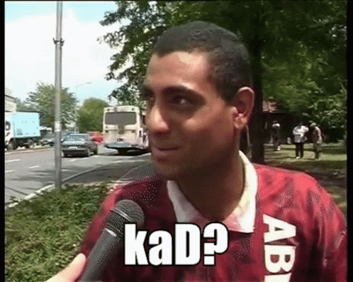 A man in a red shirt with 'AB' talks into a microphone, with the caption 'kaD?' appearing on screen.