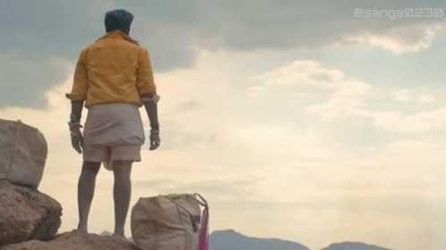 Vijay Sethupathi from Kadaisi Vivasaayi stands on a rocky hill, looking out at the vast landscape.