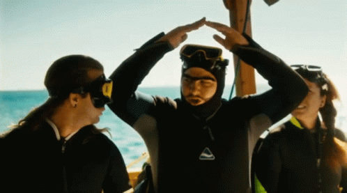 Recep İvedik making the 'Kafam Girsin' gesture while wearing a wetsuit on a boat with other divers.
