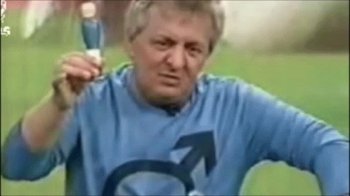 Georgiou from Kafeneio Kastan holding a small figure and exclaiming 'Ston Pato Sou!' with intensity.