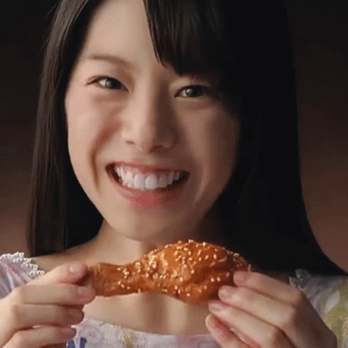 Japanese actress Kaho smiles brightly while holding a delicious piece of fried chicken.