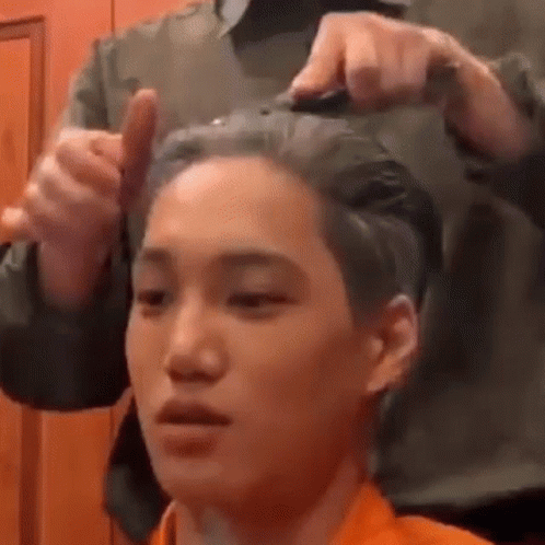Kai (Jongin) getting his hair brushed by another person, possibly for styling or grooming.
