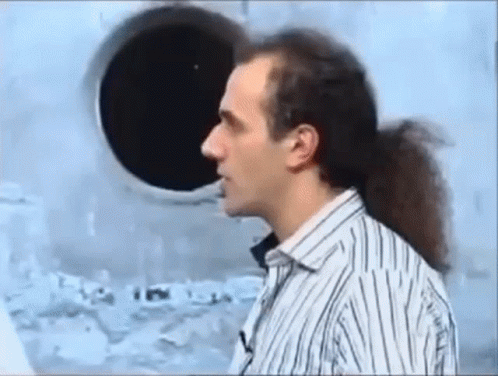 A man with long hair in a ponytail says "Kai Chemi Dedas Vficavar" in a comedic scene.