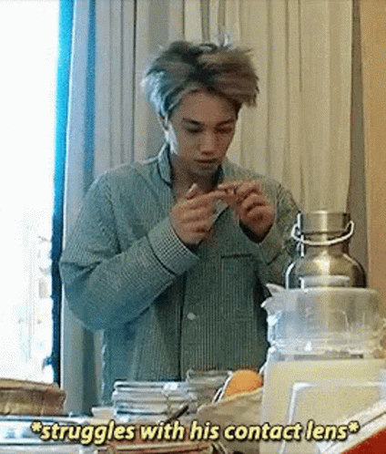 Sleepy Kai, wearing pajamas, struggles to put in his contact lens in front of a window.