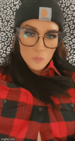 Kailey, wearing a plaid shirt and Carhartt beanie, blows a large bubblegum bubble.