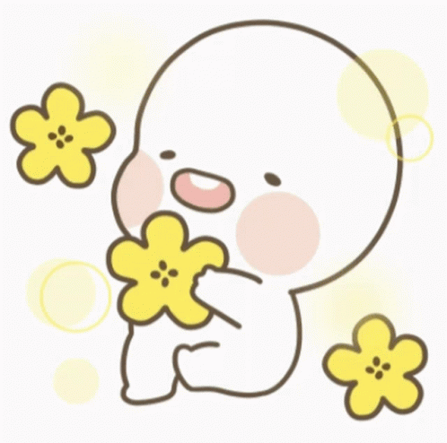 Cute Kakaotalk emoticon character holding a yellow flower, surrounded by more flowers.