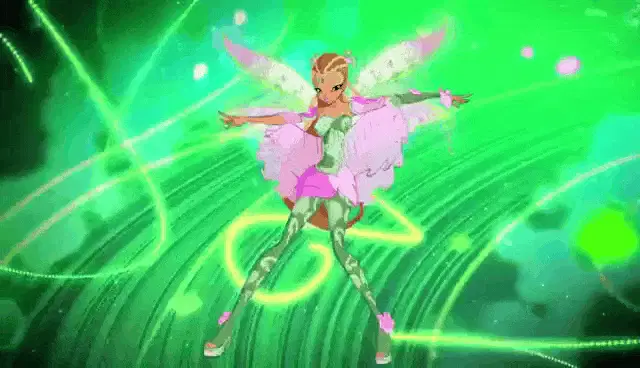 Flora, a woman in a yellow dress, shouts 'Good morning' in her kitchen with lively gestures.