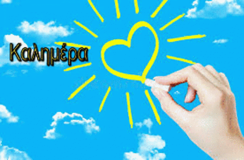 A hand draws a heart in the sky with the word "καλημερα" (Good Morning) written below it.