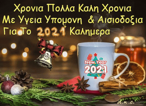A festive New Year 2021 greeting with a steaming mug, holiday decorations, and wishes for health and optimism.