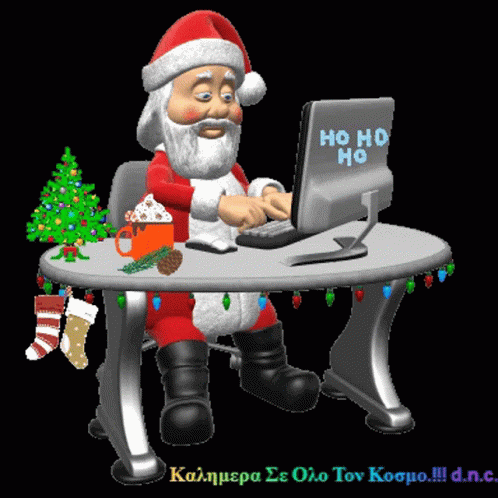 Santa Claus types "HO HO HO" on a computer, surrounded by Christmas decorations, wishing good morning to the world.