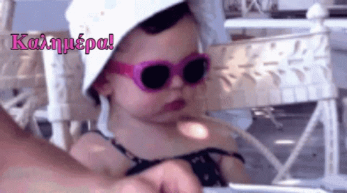 A cool kid wearing a white hat and stylish pink sunglasses adjusts their shades, with 'Καλημέρα!' text.