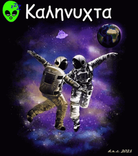 Two astronauts dance in space under a glowing UFO, wishing 'Good Night' in Greek, by Costasdarviras Dnc.