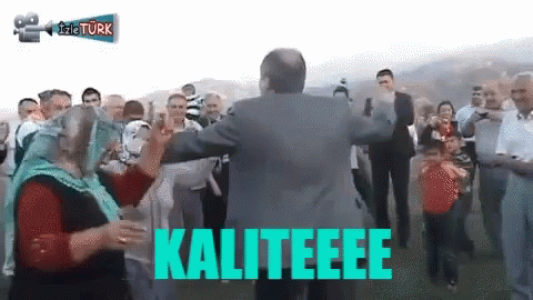 Muharrem dances energetically with a woman in a headscarf amidst a cheering crowd at a Turkish celebration.
