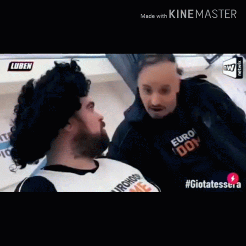 Alexander Tsouvelas and another man in conversation, one wearing an 'EURO DOM' shirt.