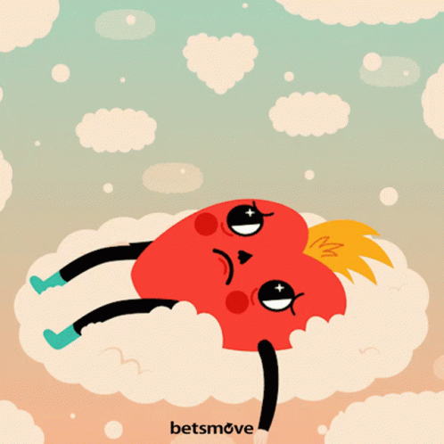 A sad cartoon heart character with yellow hair lies on a cloud in a pastel sky, with 'betsmove' text.