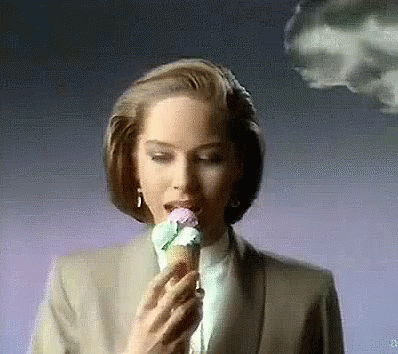 Woman in a suit reacts with pain after eating ice cream, highlighting tooth sensitivity in a commercial.