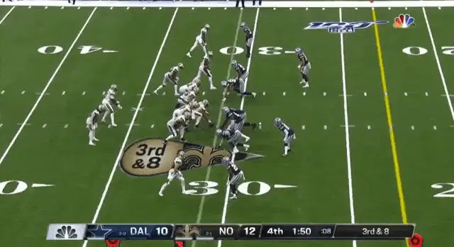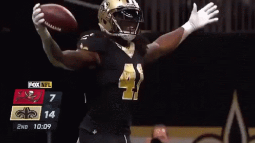 Alvin Kamara of the Saints celebrates a touchdown during a FOX NFL game against the Buccaneers.