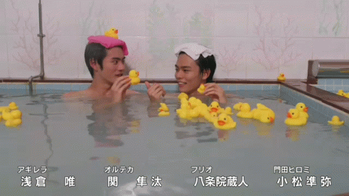 Two characters from Kamen Rider Revice, Daiji Igarashi and Ikki Igarashi, play with rubber ducks in a bathhouse.