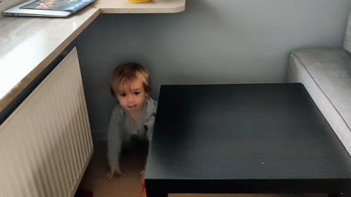 Toddler Kamiel crawls under a table and gets an unexpected head bump.