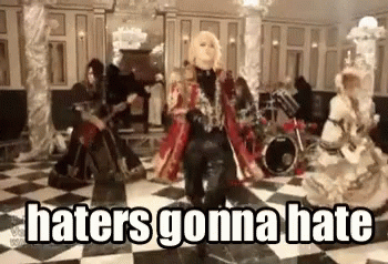 Kamijo and Versailles perform in elaborate costumes with the caption 'haters gonna hate'.