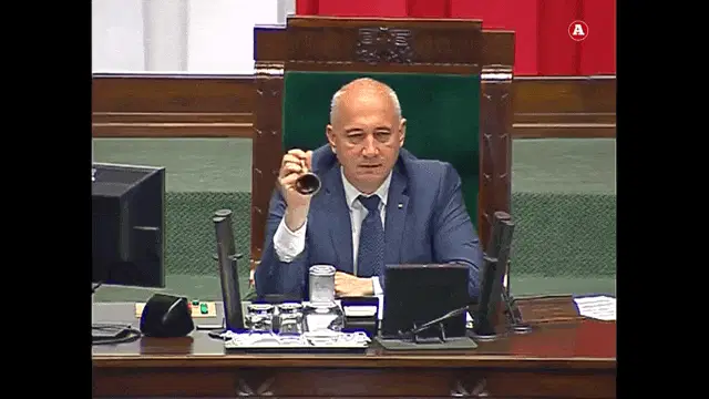 Mariusz Kamiński performing the Kozakiewicz gesture in a parliamentary setting, while others clap.