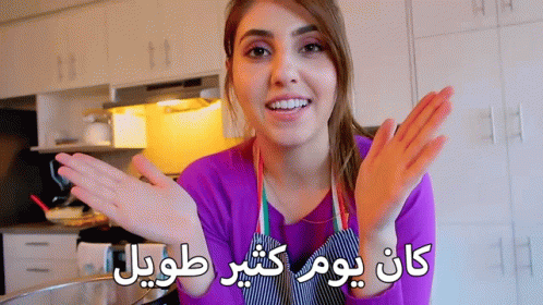 A woman in a purple shirt and apron expresses exhaustion after a very long day in the kitchen.