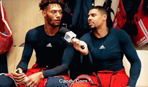 Kandre Miller and another hockey player discuss candy corn in the locker room during an interview.
