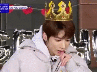 Kang Taehyun of TXT, wearing a golden crown, looks around while speaking Korean.
