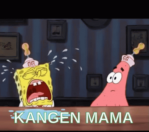 Spongebob cries intensely while Patrick looks on sadly, with the text 'Kangen Mama' displayed.