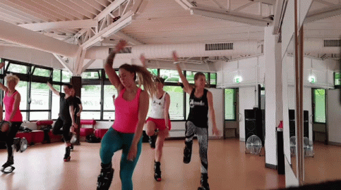 A group of people perform an energetic Kangoo Jumps workout session in a bright fitness studio.