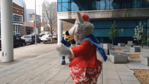 Kansas City Chiefs mascot Kc Wolf and another mascot dance and walk on a city sidewalk.