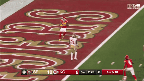 Marquez Valdes-Scantling scores a touchdown for the Kansas City Chiefs during Super Bowl LVII, with the score 10-6.