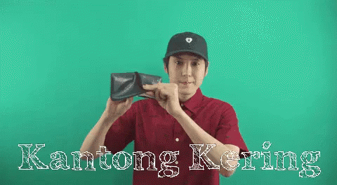 A man in a red shirt holds an empty wallet, illustrating the Indonesian phrase 'Kantong Kering' (Empty Pocket).