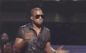Kanye West, wearing sunglasses and a leather shirt, shrugs on stage with a nonchalant expression.