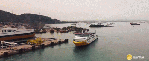 An ASDP ferry docked at a port, ready for Christmas and New Year transportation, with a scenic coastal town backdrop.